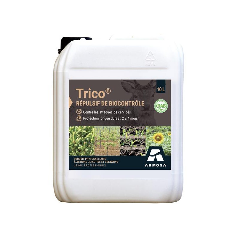 TRICO® est un répulsif concentré à action olfactive et gustative destiné à limiter les dégâts causés par les cerfs et chevreuils sur les cultures professionnelles : vignes, arbres fruitiers, pépinières, plantations forestières et ornementales.